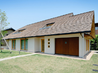 - 開口部には木製サッシを使用しています。屋根材は難燃加工を施したレッドシダーで、年を経るごとに風合いが変化することでしょう。